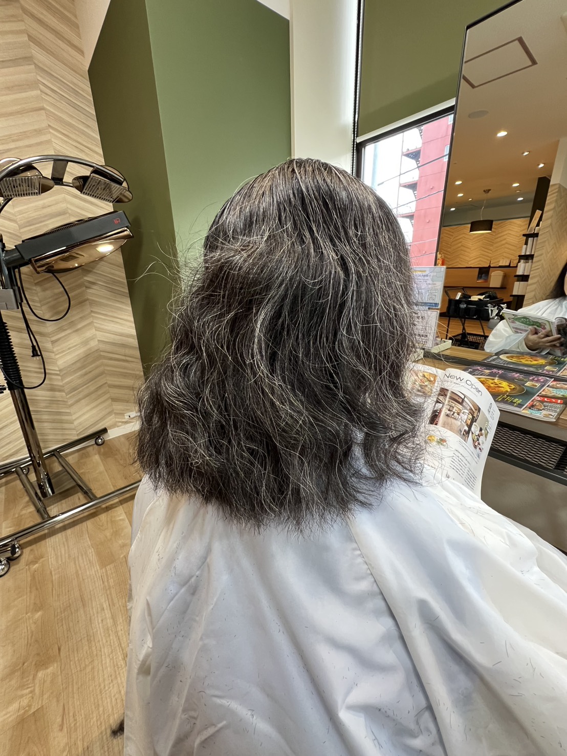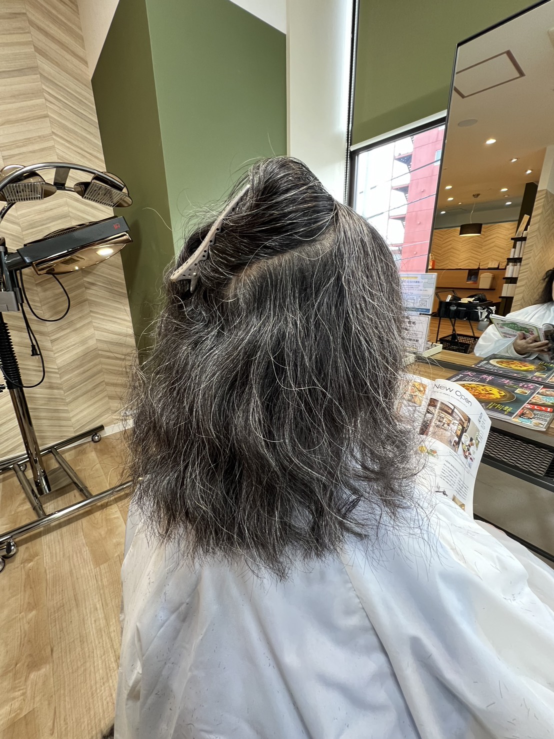 1液を根元を少し開けて髪全体に塗布していく - 加温放置(20分)